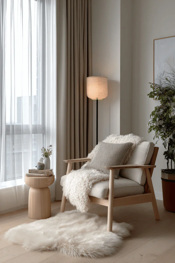 Hygge philosophy comes alive in Scandinavian reading corners where clean lines meet cozy natural textures. The minimalist aesthetic—characterized by light woods, neutral palettes, and functional design—creates calming spaces that feel both sophisticated and inviting. A draped sheepskin rug adds instant warmth and tactile luxury, transforming simple seating into a cocoon of comfort that embodies the Danish concept of coziness.