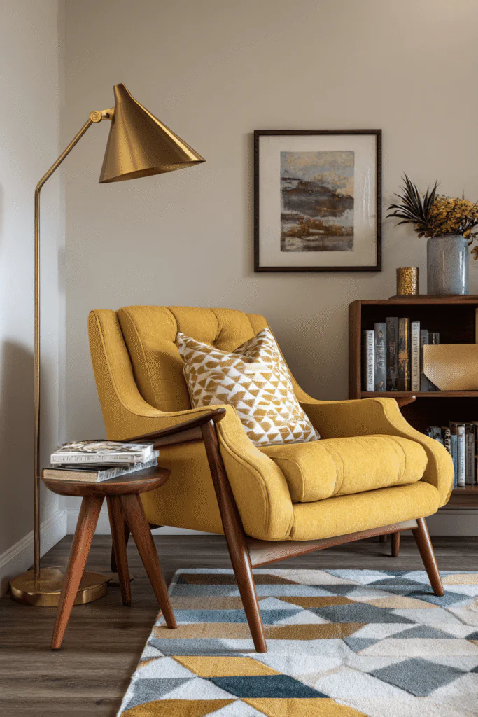 - Layer a geometric patterned rug beneath the chair—think atomic or abstract motifs