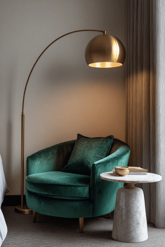 2. Velvet Accent Chair with Sculptural Floor Lamp