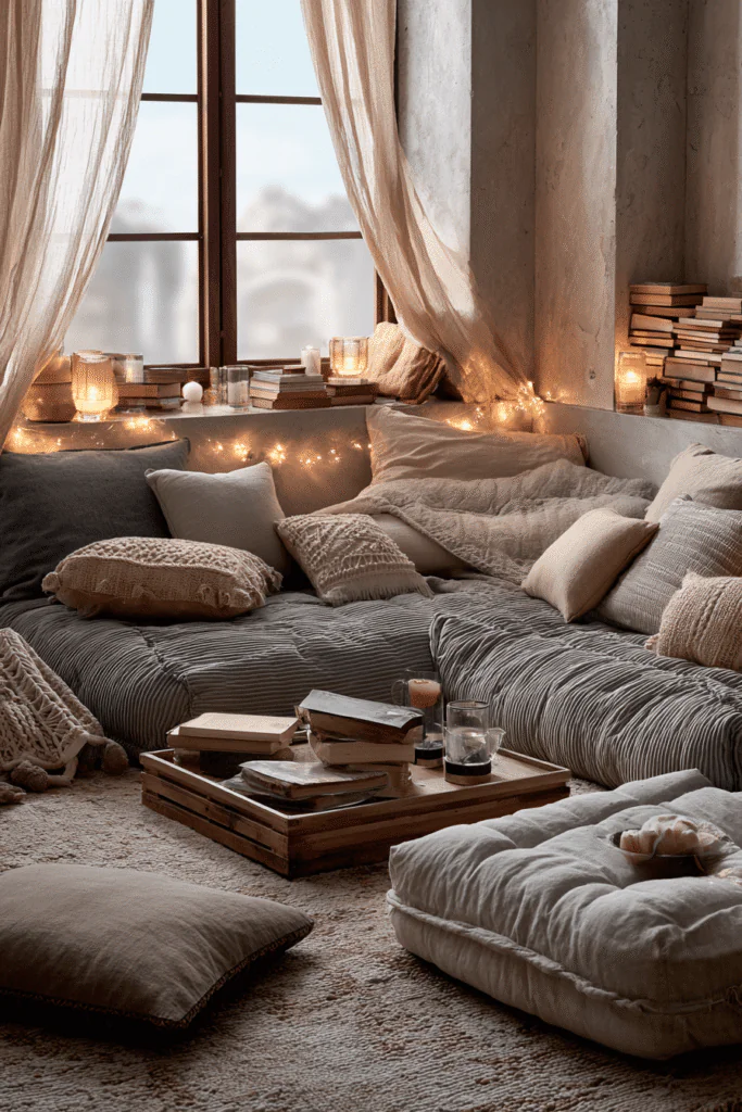 The beauty lies in the layering—mixing patterns, textures, and sizes to create depth without requiring significant floor space. Floor-level reading also has surprising ergonomic benefits, allowing you to stretch, recline, or curl up in ways rigid furniture doesn’t permit. Designers love this approach for small bedrooms or multi-functional spaces where permanent furniture feels too imposing. It’s reading reimagined as a grounded, meditative practice.