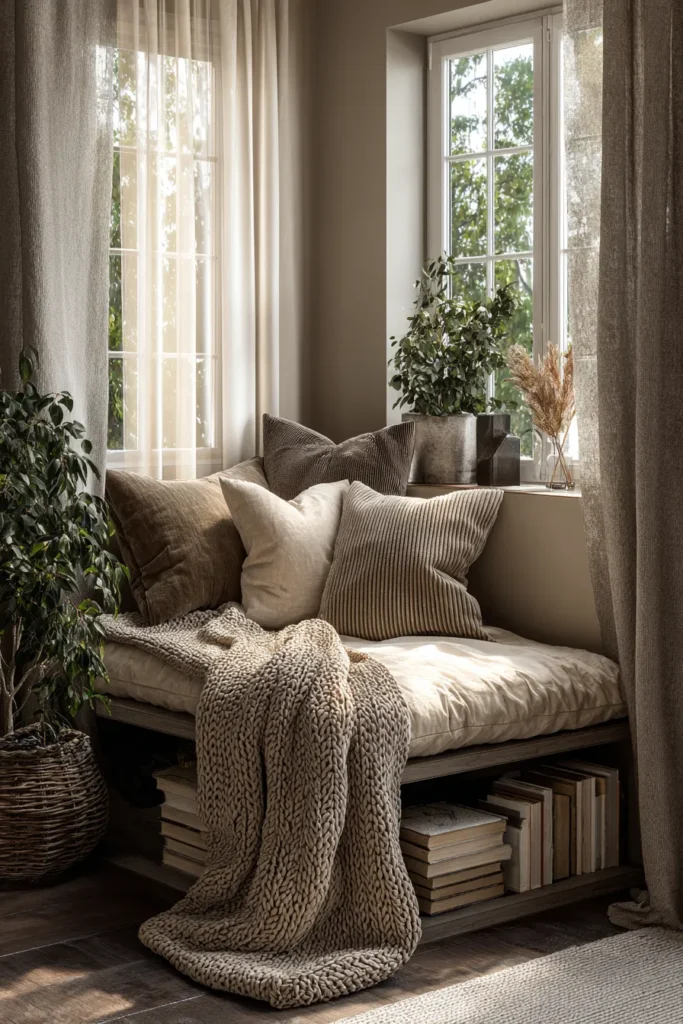 There’s something inherently peaceful about reading by a window—the way daylight shifts throughout the afternoon, the gentle hum of the outside world muted by glass. A window ledge reading nook transforms this architectural feature into a plush perch where cushions stack like clouds and throws drape casually over the edge. The key is building upward with texture: linen pillows against velvet backs, a chunky knit blanket folding into soft folds, all framed by sheer curtains that filter harsh light into a warm glow. This design works because it requires no additional furniture—just intelligent layering that turns a functional ledge into an irresistible lounging spot. It’s ideal for apartments with deep-set windows or bay window alcoves, where the architecture already carves out intimate space. The layered approach also means you can adjust comfort levels seasonally, swapping heavy wool for breathable cotton as weather shifts.