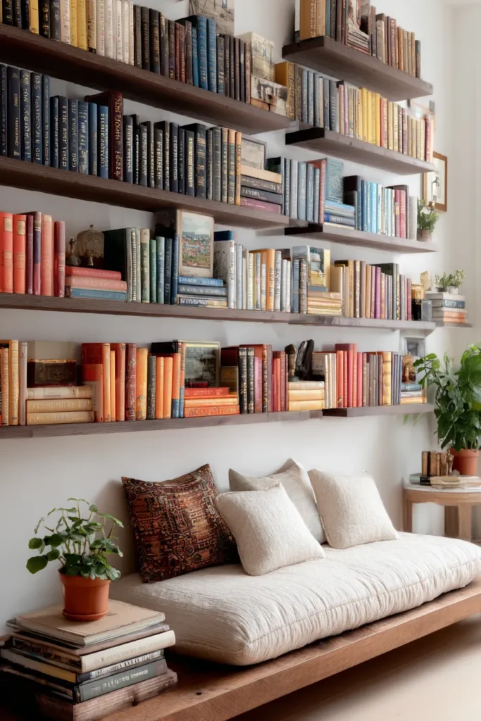 When floor space is non-negotiable, vertical real estate becomes your canvas. A floating shelf library wall transforms blank walls into a cascading display of books, plants, and personal treasures—all while keeping your reading material within arm’s reach. The magic happens in the arrangement: books stacked horizontally and vertically, spines facing out in color-coordinated sections, with negative space left intentionally to prevent visual overwhelm. Below this curated display, a simple floor cushion, pouf, or low-profile chair completes the nook. This design celebrates your collection as decor rather than hiding it away, creating a backdrop that feels both intellectual and artistic. The vertical emphasis draws the eye upward, making small spaces feel taller and more expansive. It’s a solution that works in any room—bedroom corner, living room alcove, even a wide hallway—because the shelving defines the nook without requiring structural changes.