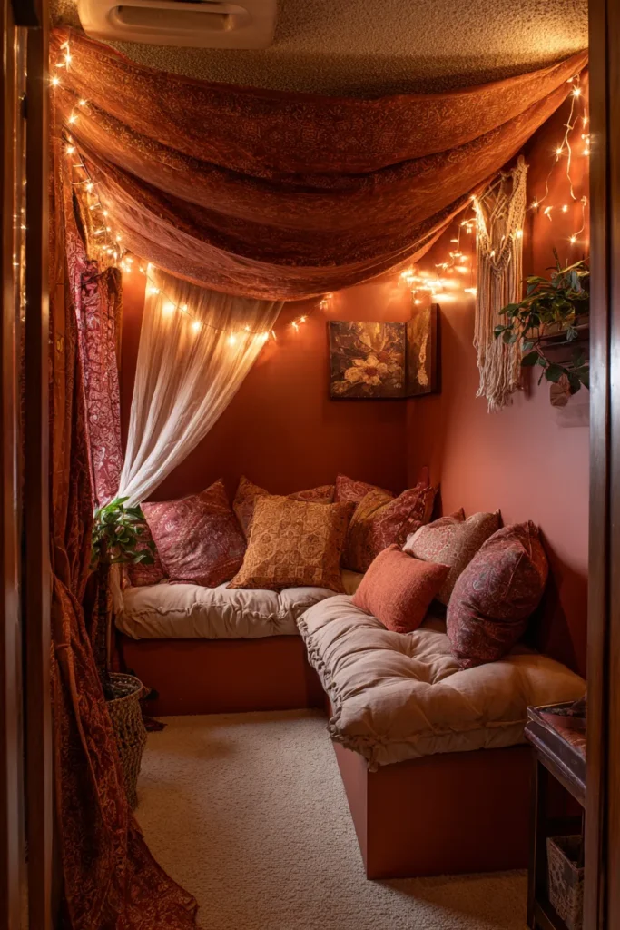 Closets often hold more potential than clothes—especially shallow coat closets or unused storage spaces that can be gutted and reimagined. A textile-layered closet retreat takes this forgotten square footage and transforms it into a fabric-wrapped cocoon where every surface invites touch. Remove the door (or replace it with a curtain for privacy), paint the interior a warm, enveloping color, and install a low bench or pile of floor cushions. Then comes the layering: hanging textiles like small tapestries or fabric panels on the walls, draping string lights from the ceiling, adding a sheepskin or faux fur throw for tactile luxury. The enclosed nature makes it feel like a secret hideaway—your own fort where the outside world fades completely. This design requires minimal construction but maximum styling, using textiles to soften hard edges and create acoustic dampening that makes the space feel quieter and more intimate.