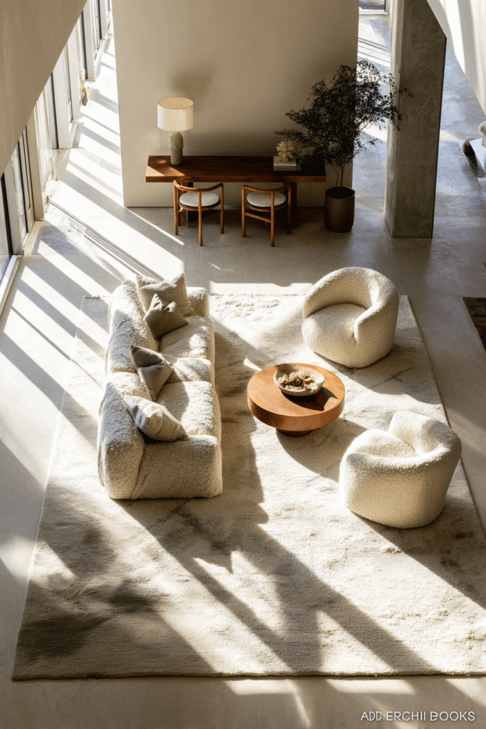 - Ground-Hugging Sofa: Select a sofa with a low back and deep seat, ideally in a light, neutral boucle or linen.7