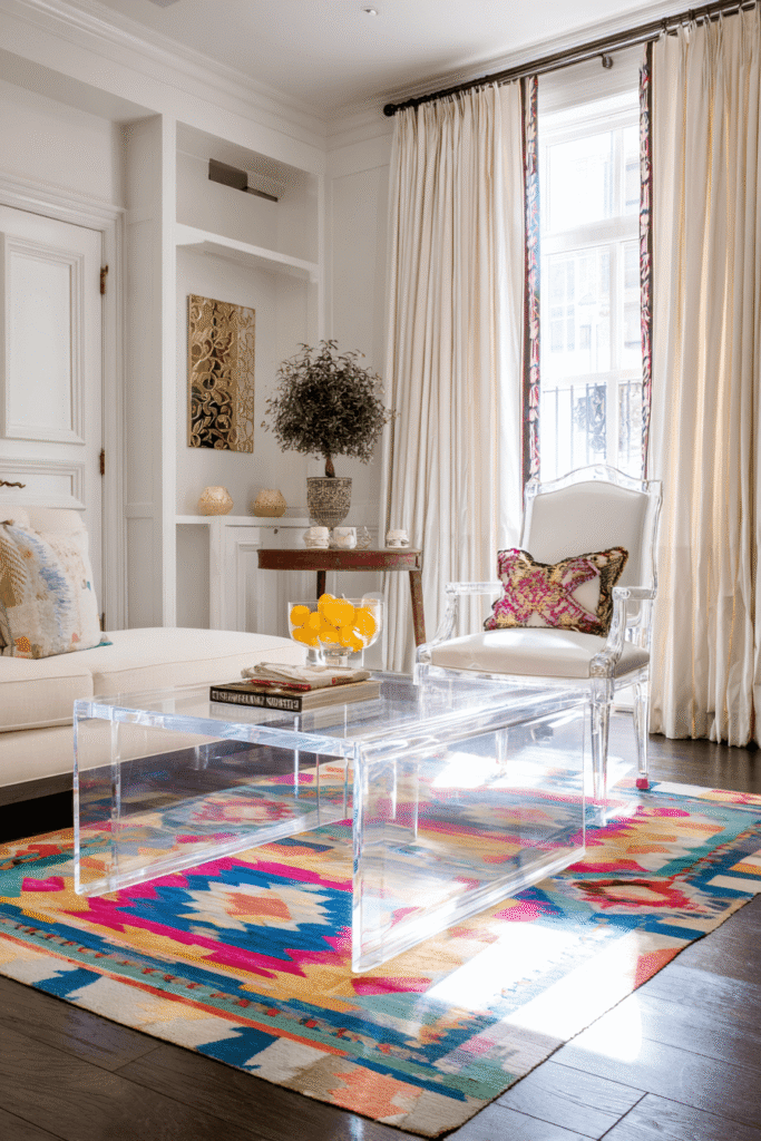 When square footage is at an absolute premium, “ghost” furniture is a secret weapon. This layout utilizes acrylic (Lucite), glass, or polycarbonate furniture that is visually weightless. Because these pieces are transparent, they allow light to pass right through them, and the eye to travel all the way to the floor and walls behind them. A clear acrylic coffee table or side chair fulfills its functional purpose while taking up zero “visual real estate”.43
