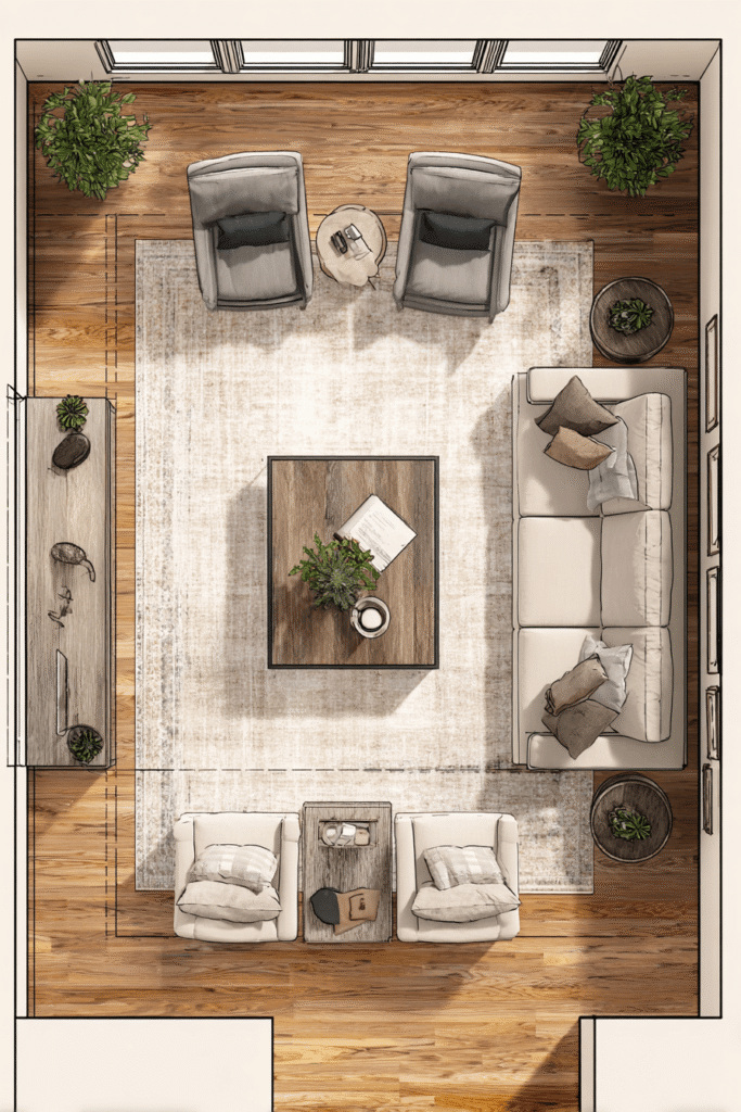 - Anchor with a Rug: Use a rug large enough that all front legs of the “floating” furniture sit on it, defining the island.