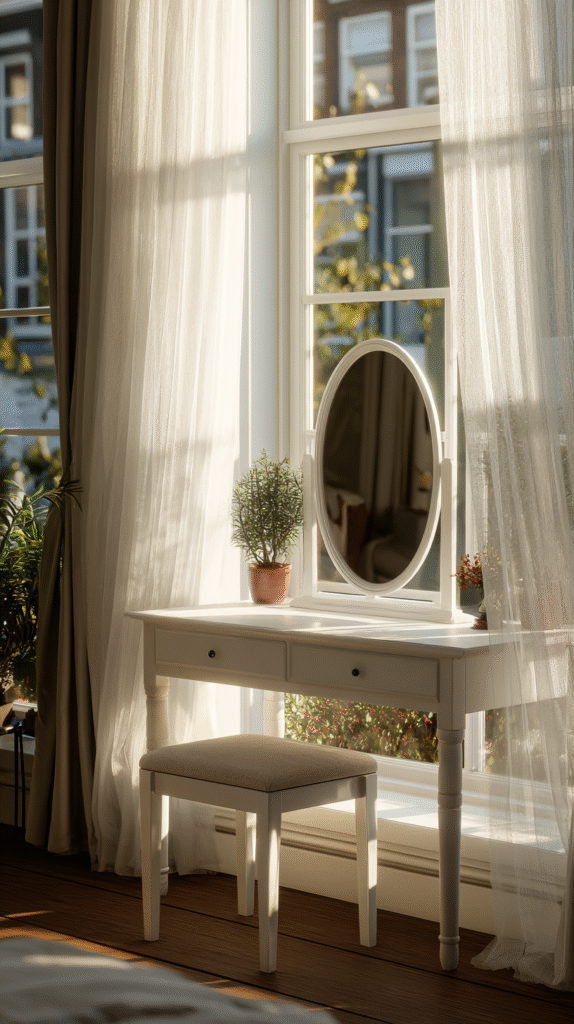 Place a simple white desk perpendicular to the window so light falls across your face evenly. Add sheer curtains if the light gets too intense, and keep a small tabletop mirror that can pivot to catch the best angles. This setup is especially perfect for anyone who photographs their makeup looks because that natural light is chef’s kiss. Don’t forget to add some potted plants on the windowsill for extra freshness!