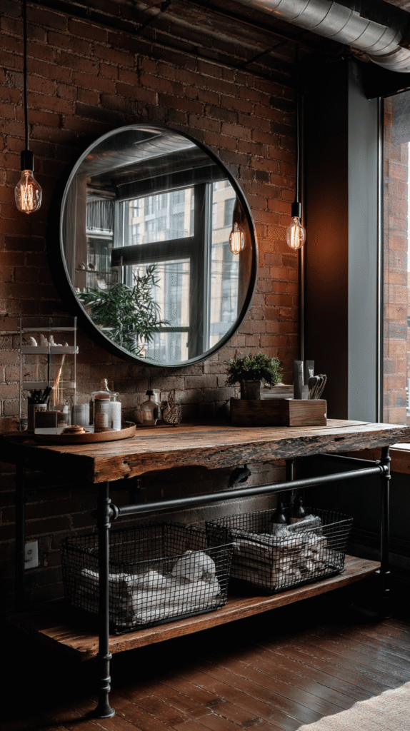 Love that edgy, industrial aesthetic? Create a vanity using reclaimed wood planks and black metal pipe legs. This DIY-friendly option gives you that trendy loft vibe while being surprisingly budget-friendly.
