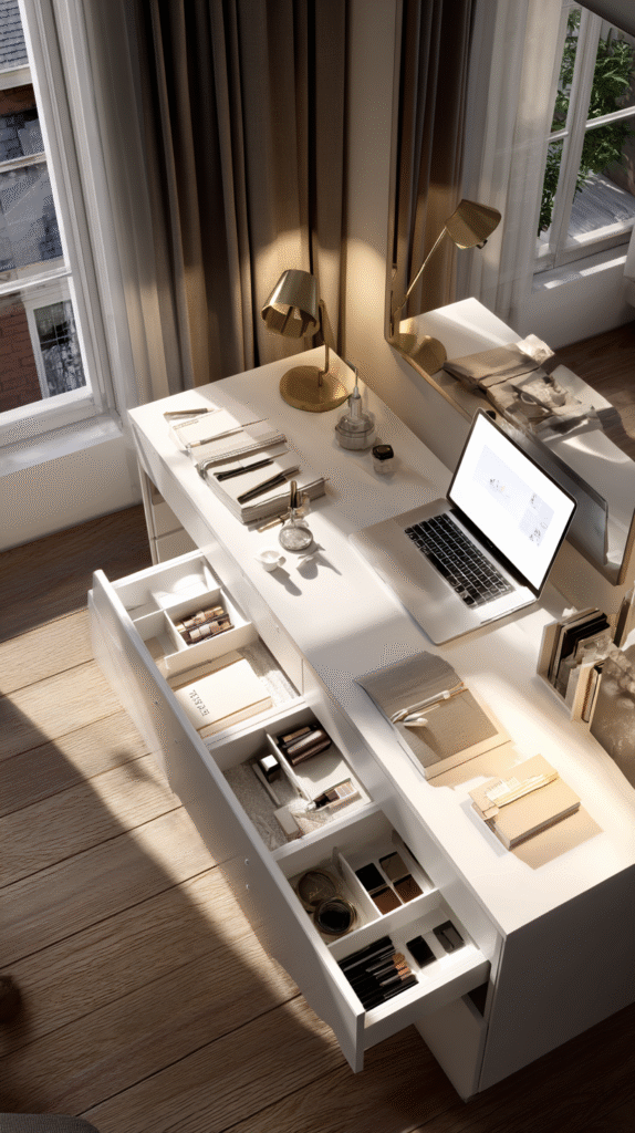 Real talk—not everyone has space for a separate vanity and desk. The solution? Make them the same piece. Choose a modern desk with enough surface area and good drawer storage, then designate one side for beauty and the other for work or hobbies.