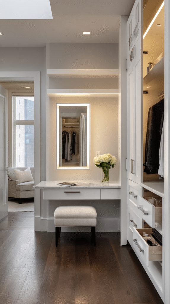 You don’t need a massive walk-in closet to make this work. Even a reach-in closet can accommodate a small pull-out vanity or flip-down mirror setup. If you’re planning a complete closet overhaul, these wardrobe design bedroom ideas offer plenty of inspiration.