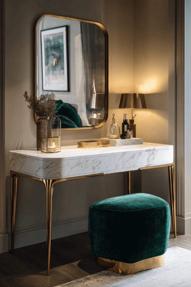 Designer’s Secret: Upholster in performance velvet rather than natural silk velvet to prevent water spotting and product staining inevitable in vanity environments. Modern performance fabrics offer identical luster and texture while providing stain resistance through nano-coating technology. Specify Crypton or Sunbrella performance velvet in warm caramel, rust, or olive tones that camouflage minor makeup smudges between professional cleanings.