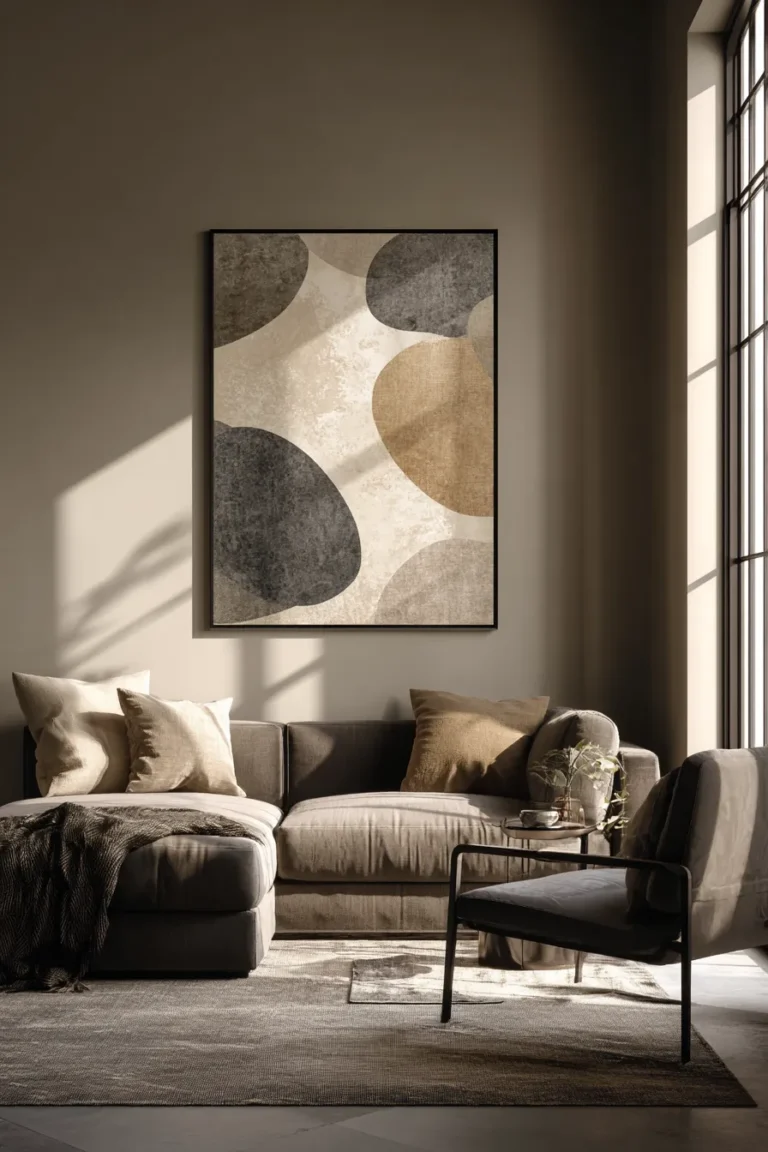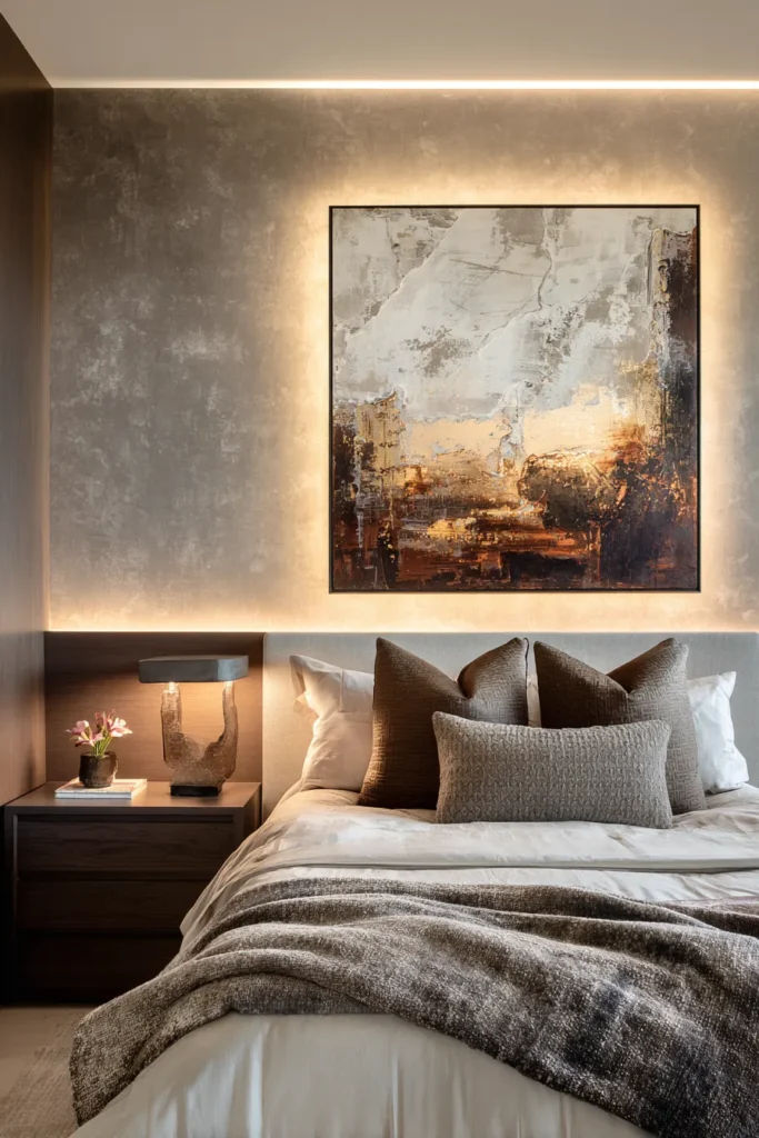 The monolithic canvas trend replaces busy gallery walls with one commanding focal point that anchors the entire room. We’re seeing abstract works in desaturated earth tones—burnt sienna, raw umber, charcoal grey—with visible brushstroke texture that catches light differently throughout the day. The key is scale: your canvas should span 60-75% of your bed’s width to create proper visual weight.