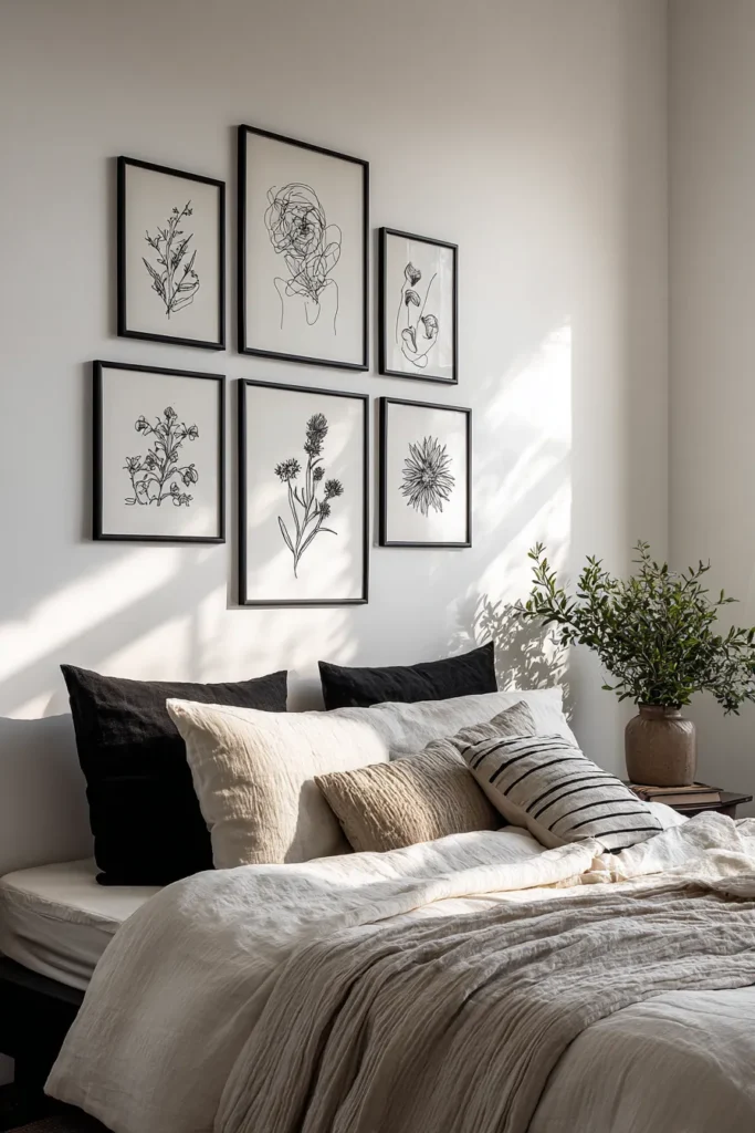 Best For: Small bedrooms where large art overwhelms, minimalist Japandi aesthetics, and budget-conscious designers (quality line drawings: $80-150 each vs. $800+ for original paintings).
