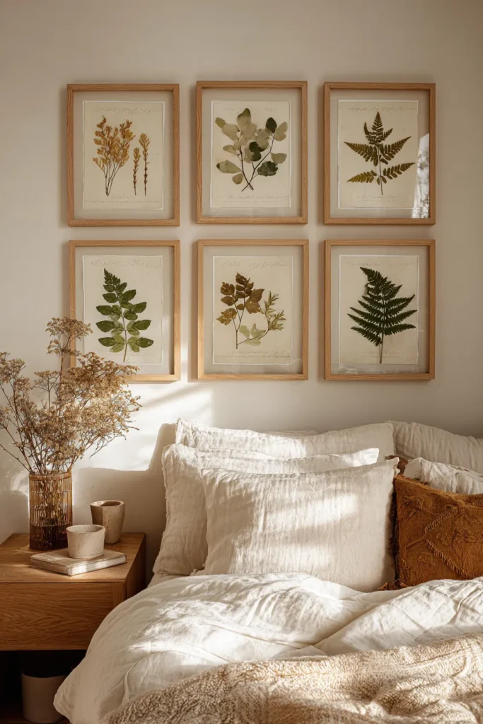 Pressed ferns, dried grasses, or vintage herbarium specimens under glass bring scientific curiosity into the bedroom. Mount these in matching frames—six to nine specimens in a grid—with handwritten Latin nomenclature labels for an apothecary aesthetic.