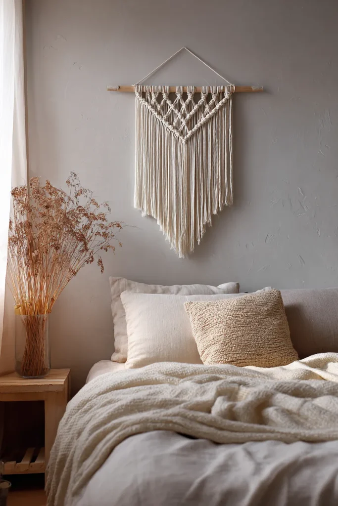 Designer’s Secret: Hang macramé minimum 35cm from the headboard, never directly touching. Natural fibers shed microscopic particles, and you don’t want cotton dust in your bedding. The gap also allows the piece to move slightly with air circulation, creating subtle kinetic interest.