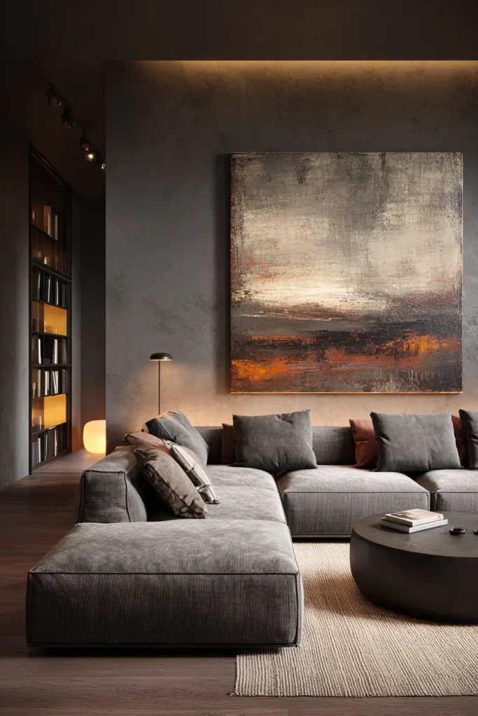 A single large-scale abstract canvas commands attention without competing for it. Think bold brushstrokes in moody charcoals, warm terracottas, or jewel-toned blues that stretch across 60 inches or more. The expansive format creates a gallery-like atmosphere, turning your living room into a curated space where art becomes architecture. This approach works beautifully above low-profile sofas or floating media consoles, where the artwork can breathe and establish itself as the room’s visual anchor.