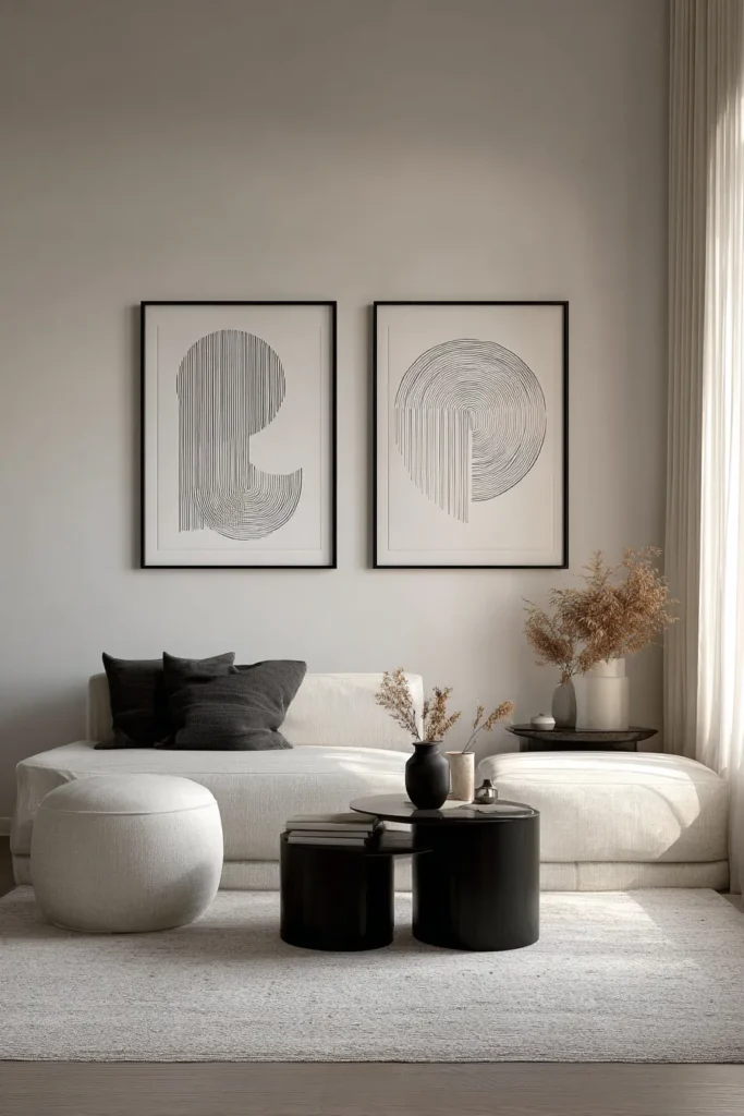 - Select large-format line drawings (18×24 inches minimum) for sufficient presence on living room walls