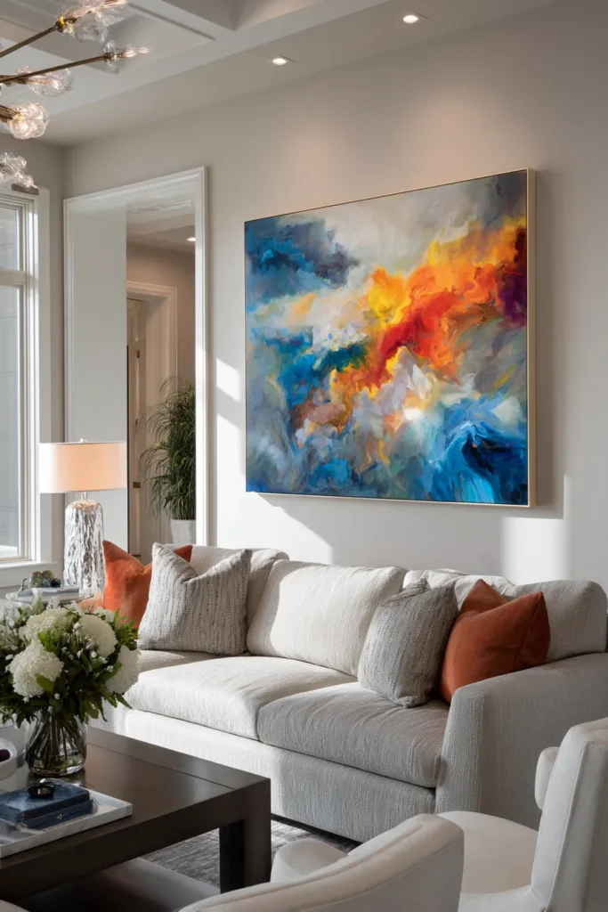 - Echo the artwork’s colors subtly in 2-3 accessories—pillows, vases, or throws