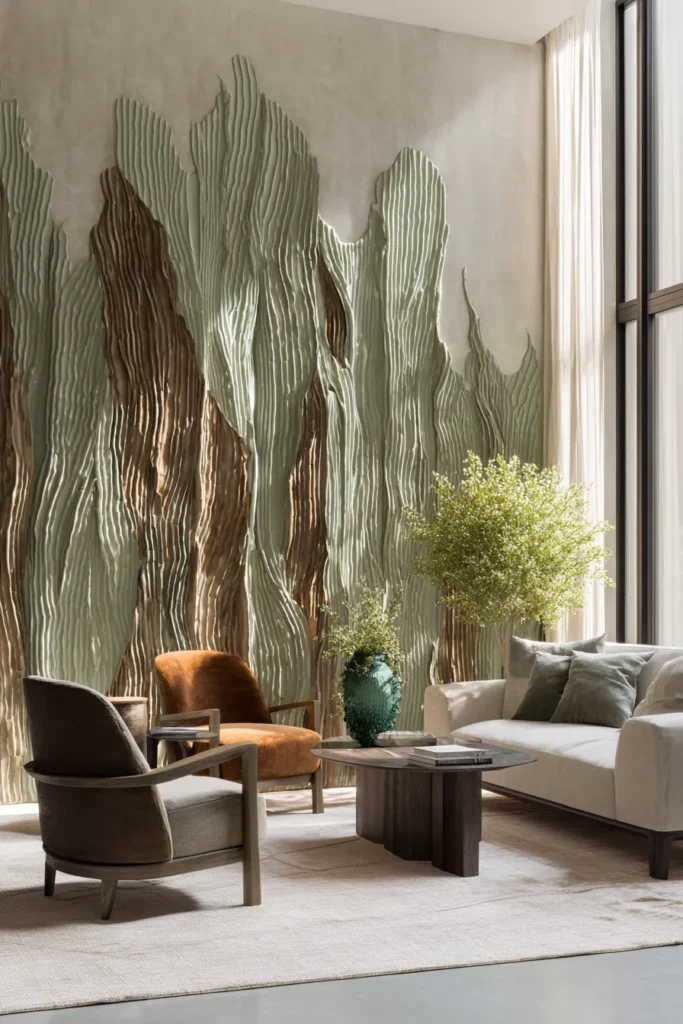 Sculptural ceramic wall art brings handcrafted texture and organic irregularity to living room walls, offering a sophisticated alternative to flat paintings or prints. Think dimensional tile installations, relief-carved clay panels, or abstract ceramic sculptures mounted directly to walls like bas-reliefs. The beauty lies in how these pieces interact with light—glazed surfaces catching afternoon sun, shadows deepening in recessed areas, natural clay tones warming as daylight shifts. In 2026, artisan ceramics in earthy tones—terracotta, sage green, matte white—are replacing mass-produced wall décor in design-conscious homes.