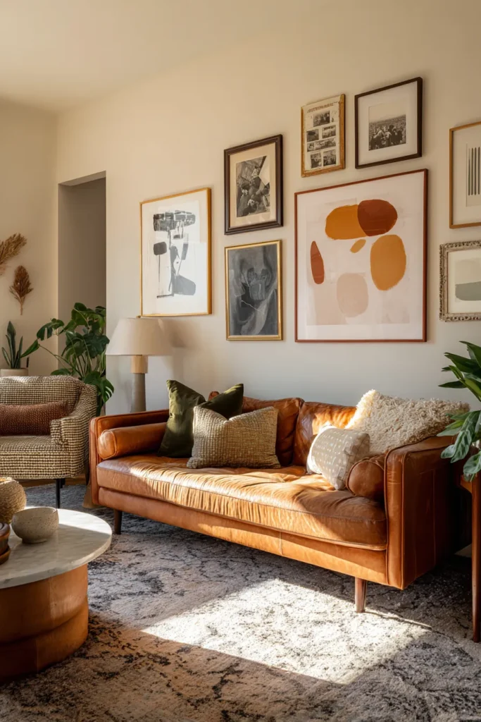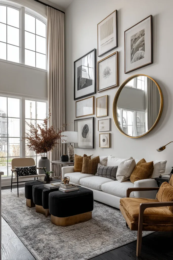 A gallery wall living room arrangement tells a collected-over-time story, blending personal photography, vintage finds, small paintings, and textured prints into one cohesive visual narrative. The magic lies in the controlled chaos—mixing black, natural wood, and brass frames in varying widths, while maintaining consistent spacing between pieces. This approach transforms an empty wall into a dynamic focal point that invites closer inspection, revealing layers of personality with each glance.