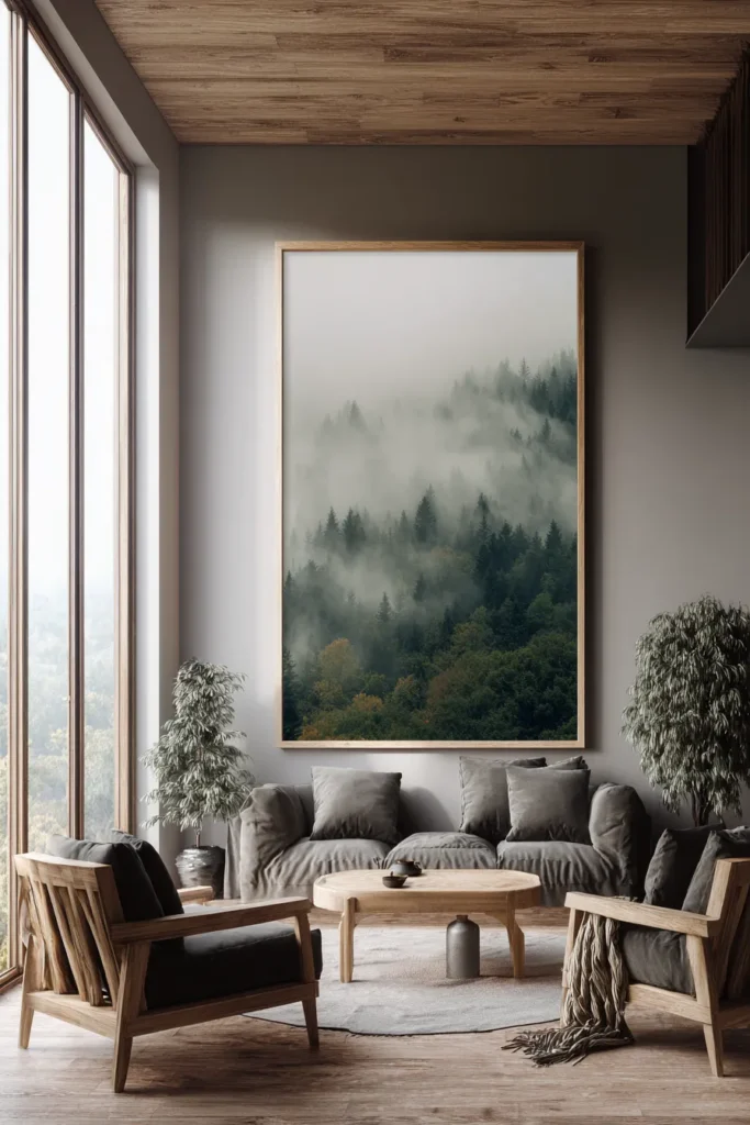A single stunning nature photograph—crashing waves, misty forests, desert landscapes, mountain vistas—brings meditative calm and expansive beauty to living room walls. Large-format photography (40×60 inches or bigger) transforms walls into windows onto other worlds, offering psychological escape and serene focal points that ground busy lives. The photographic realism creates depth perception that paintings cannot achieve, making small rooms feel more spacious and closed-in walls seem to open outward. In 2026, designers favor nature photography with movement—flowing water, wind-swept grasses, or shifting clouds—over static landscapes.