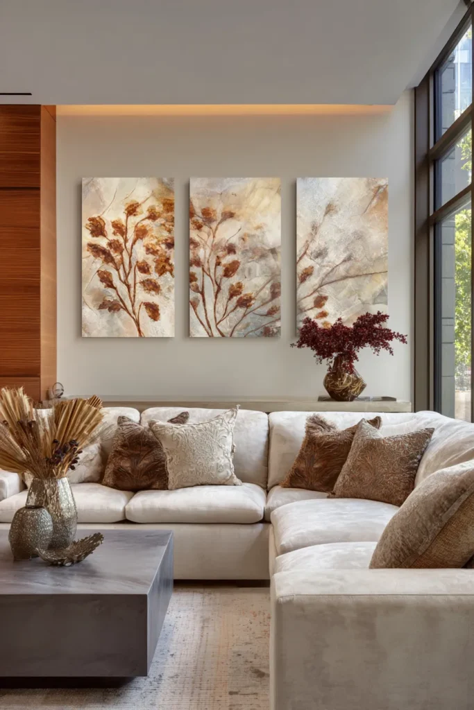 Triptychs work particularly well in contemporary and transitional living rooms where clean lines and intentional spacing define the aesthetic. The format feels more dynamic than a single canvas because it creates natural pause points, allowing the eye to rest while still maintaining visual continuity. In 2026, designers are favoring triptychs with nature-inspired themes—coastal horizons, mountain ranges, or organic abstracts in earthy tones that bring outdoor serenity inside. The three-panel format also allows you to play with tonal variations, moving from light to dark across the sequence.