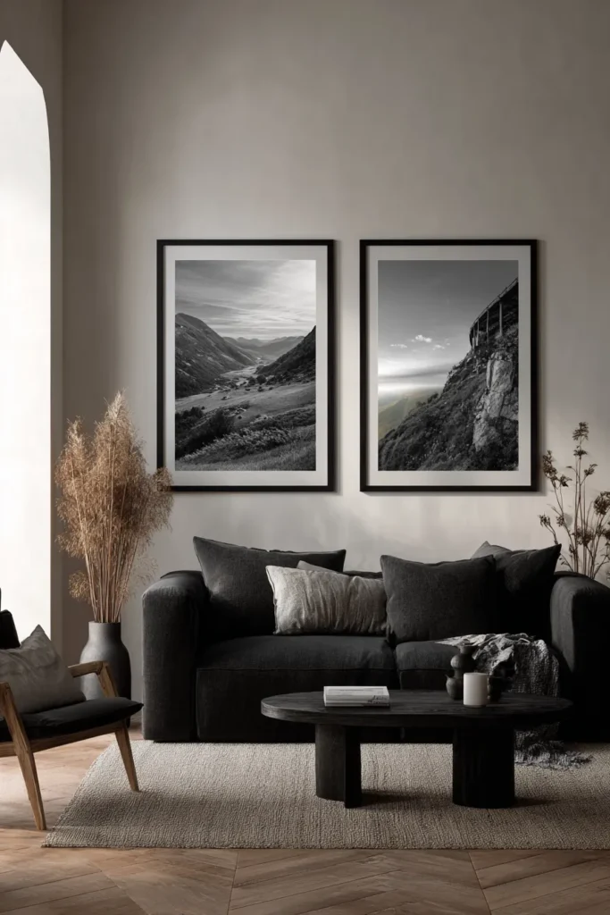 This approach works beautifully in spaces where you want the walls to complement rather than dominate. Black and white photography pairs effortlessly with any décor style—from industrial lofts with exposed brick to coastal homes with whitewashed shiplap. In 2026, designers are gravitating toward larger-format photography (24×36 inches or bigger) in slim black frames with generous white matting, creating clean negative space that amplifies each image’s impact. The key is choosing photographs with strong contrast and clear subjects that read well from across the room.