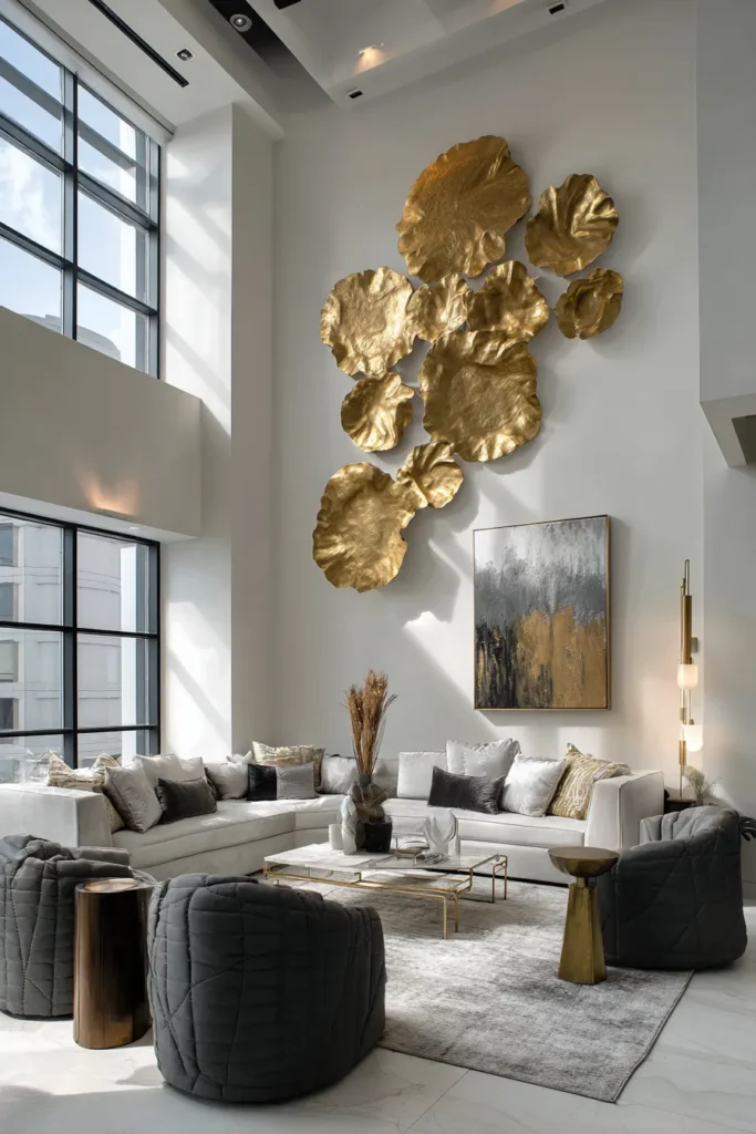 Three-dimensional metal wall art introduces architectural interest and plays with light in ways flat artwork cannot. Whether you choose geometric abstracts in blackened steel, organic leaf patterns in brushed brass, or contemporary wire sculptures, metal pieces create shadow play that shifts throughout the day as natural light moves across your walls. The sculptural quality adds masculine sophistication and works beautifully in both modern industrial spaces and refined transitional homes. In 2026, designers favor oversized single pieces over clustered arrangements—think wall-mounted sunbursts, abstract metal ribbons, or nature-inspired branches in aged bronze.