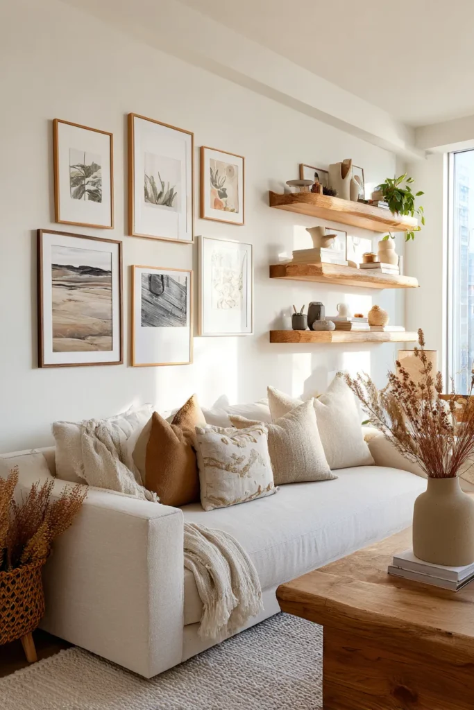 - Incorporate sculptural objects—ceramic vases, brass candlesticks, small plants—between frames