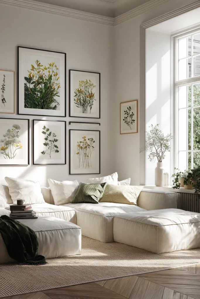 Botanical wall art living room arrangements create calming, grounded atmospheres that work across multiple design styles—from modern farmhouse to coastal minimalist to Scandinavian hygge. The key is scale: oversized prints (24×36 inches or larger) make confident statements without feeling overly decorative. In 2026, the trend favors simple presentations—slim black or natural wood frames with generous white matting that creates breathing room around each specimen. Grouping three botanical prints vertically or horizontally creates rhythm while maintaining the serene, organized feel that makes this style so appealing.